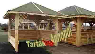 Altanę ogrodową czworokątną 3mx3m z siedziskiem z grubego bala ( wym. po zew. słupa). Pokrycie: deska/papa/gont bitumiczny (kolor do wyboru: jesień, zieleń).