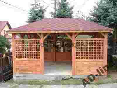 Drogi kliencie dziękujemy za zainteresowanie się naszą ofertą altany. Oferujemy altanę prostokątną o wymiarach 3,5m x 4,5m wykonaną z drewna sosnowego. Altana zbudowana jest na słupach 9cm x 9cm co zapewnia jej bardzo solidną konstrukcję. Dach wykonany jest z desek boazeryjnych, pokryty gontem bitumicznym firmy Technonicol ( wzór i kolor gontu do wyboru klienta ). Altana posiada cztery wejścia ( z możliwością zabudowy jednego, dwóch lub trzech wejść, według zamówienia klienta ). Altana malowana jest dwukrotnie ekologicznym impregnatem DREWNOCHRON z domieszką wosku. Kolor prezentowanej altany to "TIK"