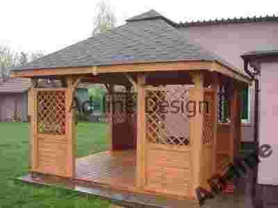 Drogi kliencie dziękujemy za zainteresowanie się naszą ofertą altany. Oferujemy altanę prostokątną o wymiarach 3,5m x 4m wykonaną z drewna sosnowego. Altana zbudowana jest na słupach 9cm x 9cm co zapewnia jej bardzo solidną konstrukcję. Dach wykonany jest z desek boazeryjnych, pokryty gontem bitumicznym firmy Technonicol ( wzór i kolor gontu do wyboru klienta ). Altana posiada cztery wejścia ( z możliwością zabudowy jednego, dwóch lub trzech wejść, według zamówienia klienta ). Altana malowana jest dwukrotnie ekologicznym impregnatem DREWNOCHRON z domieszką wosku. Kolor prezentowanej altany to "TIK"