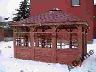 Drogi kliencie dziękujemy za zainteresowanie się naszą ofertą altany. Oferujemy altanę kwadratową o wymiarach 4m x 4m, wykonaną z drewna sosnowego. Altana zbudowana jest na słupach 12cm x 12cm co zapewnia jej bardzo solidną konstrukcję. Dach wykonany jest z desek boazeryjnych, pokryty gontem bitumicznym firmy Technonicol ( wzór i kolor gontu do wyboru klienta ). Altana posiada cztery wejścia ( z możliwością zabudowy jednego, dwóch lub trzech wejść, według zamówienia klienta ). Altana malowana jest dwukrotnie ekologicznym impregnatem DREWNOCHRON z domieszką wosku.