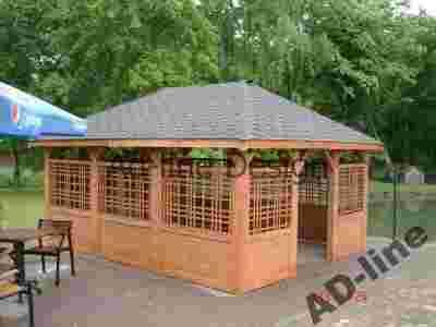 Drogi kliencie dziękujemy za zainteresowanie się naszą ofertą altany. Oferujemy altanę prostokątną o wymiarach 4m x 5m, wykonaną z drewna sosnowego. Altana zbudowana jest na słupach 12cm x 12cm co zapewnia jej bardzo solidną konstrukcję. Dach wykonany jest z desek boazeryjnych, pokryty gontem bitumicznym firmy Technonicol ( wzór i kolor gontu do wyboru klienta ). Altana posiada cztery wejścia ( z możliwością zabudowy jednego, dwóch lub trzech wejść, według zamówienia klienta ). Altana malowana jest dwukrotnie ekologicznym impregnatem DREWNOCHRON z domieszką wosku.