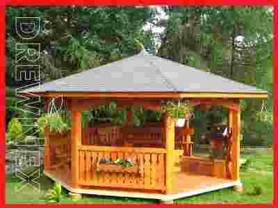 Cena aukcji Allegro zawiera wykonanie solidnej altany ogrodowej z czterostronnie struganych masywnych elementów z drewna świerkowego.