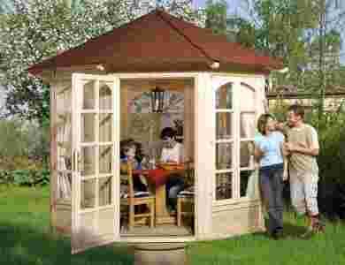 Ekskluzywna ośmiokątna altana o dużej powierzchni przeszkleń należy do najbardziej prestiżowych w ofercie. Na jej ściankach umieszczono wysokie, otwierane, szklane okna ze szprosami, których kształt łagodzi lekko zaokrąglona linia w ich górnej części. Drzwi zachowują identyczny rytm przeszkleń. Proporcjonalną całość zamyka kilkuspadowy dach, którego odporność podnosi pokrycie bitumiczne. Altana może służyć podczas przerw w pracach ogrodowych lub jako piękna sceneria do posiłków zorganizowanych w plenerze. Sprawdzi się również podczas uroczystych, a także mniej zobowiązujących przyjęć.