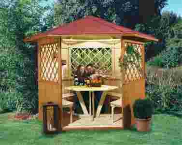 Sześciokątna altana ogrodowa z dachem w kształcie odpowiadającym formie podstawy. Powierzchnia dachu kryta gontem. Posiada szerokie wejście o rozpiętości jednej ścianki. Wyposażona w podłogę. Okna z dekoracyjnym wypełnieniem w postaci ukośnej kratki dodają jej lekkości i wytworności.