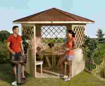 Sześciokątna altana ogrodowa z dachem w kształcie odpowiadającym formie podstawy. Powierzchnia dachu kryta gontem. Posiada szerokie wejście o rozpiętości jednej ścianki. Wyposażona w podłogę. Okna z dekoracyjnym wypełnieniem w postaci ukośnej kratki dodają jej lekkości i wytworności.