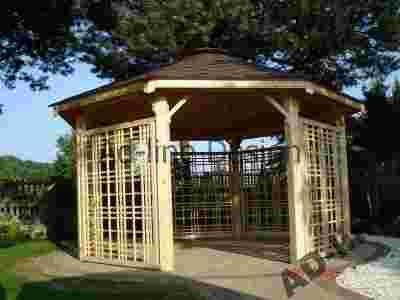 Drogi kliencie dziękujemy za zainteresowanie się naszą ofertą altany. Oferujemy altanę ośmiokątną o średnicy 4m, wykonaną z drewna sosnowego. Altana zbudowana jest na słupach 12cm x 12cm co zapewnia jej bardzo solidną konstrukcję. Dach wykonany jest z desek boazeryjnych, pokryty gontem bitumicznym firmy Technonicol ( wzór i kolor gontu do wyboru klienta ). Altana posiada sześć wejść ( z możliwością zabudowy jednego wejścia, według zamówienia klienta ). Altana malowana jest dwukrotnie ekologicznym impregnatem DREWNOCHRON z domieszką wosku.