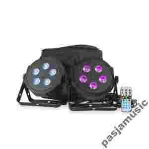 ADJ VPar Pak to zestaw dwóch kompaktowych, płaskich parów VPAR LED, miękkiej torby i pilota zdalnego sterowania. VPAR-y posiadają 5x 4-watowych diod LED 4-w-1 (czerwony, zielony, niebieski, bursztynowy), podwójny uchwyt montażowy, gumowe nóżki do stawiania na ziemi i 4 przyciskowy wyświetlacz LCD DMX.