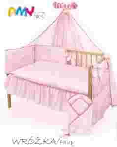 Ochraniacz uszyto z obustronnej 100% bawełny , mocowany do łóżeczka za pomocą wiązanych kokardek (8 punktów łączenia) oraz dekoracyjnymi kokardami; dodatkowe wzmocnienia na brzegach i wewnętrznie ściegiem wielonitkowym (wzmacniającym i ułatwiającym zachowanie kształtu, nawet po wielokrotnym praniu.) W kolorze zestawu z aplikacją MAŁEJ UROCZEJ WRÓŻKI.
