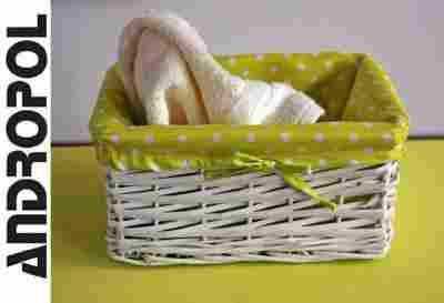 Białe kosze wiklinowe wyściełane są kolorową tkaniną chroniącą zawartość przed zaczepianiem. Idealne na łazienkowe drobiazgi, biżuterię czy skarby w pokoju dziecka.