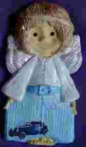 Aniołek KACPEREK błękitny z autkiem. Urodził się z gipsu ceramicznego w ramach mojej fascynacji tematyką anielską połączonej z zabawami artystycznymi.