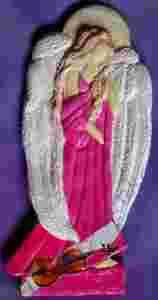 Aniołek SOFIA magenta z instrumentem muzycznym. Urodził się z gipsu ceramicznego w ramach mojej fascynacji tematyką anielską połączonej z zabawami artystycznymi.