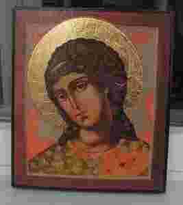 IKONKA WYKONANA NA DESCE SOSNOWEJ,POKRYTA ZŁOCENIAMI I WERNIKSEM POSTARZAJĄCYM,ZABEZPIECZONA LAKIEREM AKRYLOWYM.