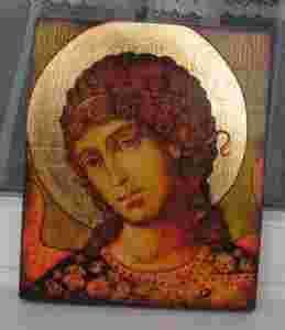 IKONKA WYKONANA NA DESCE SOSNOWEJ,POKRYTA ZŁOCENIAMI I WERNIKSEM POSTARZAJĄCYM,ZABEZPIECZONA LAKIEREM AKRYLOWYM.