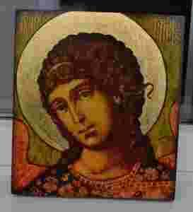 IKONKA WYKONANA NA DESCE SOSNOWEJ,POKRYTA ZŁOCENIAMI I WERNIKSEM POSTARZAJĄCYM,ZABEZPIECZONA LAKIEREM AKRYLOWYM.