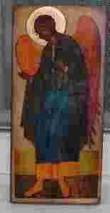 IKONKA WYKONANA NA DESCE SOSNOWEJ,POKRYTA ZŁOCENIAMI I WERNIKSEM POSTARZAJĄCYM,ZABEZPIECZONA LAKIEREM AKRYLOWYM.