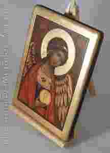 Z tyłu znajduje się ręcznie robiona druciana zawieszka oraz informacja o ikonie.