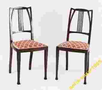 Meble o formie typowej dla stylu secesji geometrycznej. Krzesła o prostych i delikatnych, bardzo ładnie zaprojektowanych kształtach. Ramiaki oparć przeplatane, tworzące ciekawą linię.