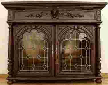 Prezentowany mebel wykonano w stylu charakterystycznym neorenesansowym, biblioteka powstał pod koniec XIX wieku ok. 1[zasłonięte]870-19 Mebel wyróżnia się przepięknymi ozdobami, wykonanymi z wielkim wyczuciem architektonicznym. Cechą charakterystyczną są oryginalne witraże które tworzą cudowny klimat, dodatkowo bardzo rozbudowana jest dekoracja rzeźbiarska. Mebel wykonano z drewna dębowego. Komoda posiada dwie półki z regulację wysokości.
