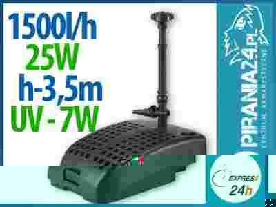 Pompofiltr NPUV-1500 to kompletny zestaw pompy filtracyjnej wraz z lampa przeciwglonową UVC 7W (zamontowaną wewnątrz korpusu pompy). Połączenie to zapewnia pełen proces biologicznego i chemicznego oczyszczania oczka wodnego, co gwarantuje długotrwały efekt czystej wody. W zestawie znajduje się gąbka filtracyjna, złoże biologiczne - zeolit oraz dysza fontannowa trzystopniowa.