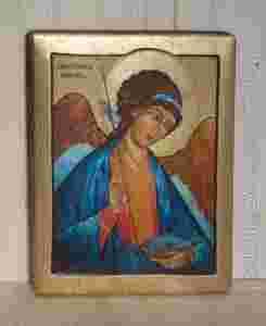 Nierówności są celowe i wraz z delikatną siatką spękań i patyny nadają stylowy charakter ikonie. Ten ciekawy efekt został osiągnięty dzięki własnej technice z udziałem transferu.