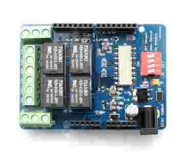 Relay Shield wyposażony jest w 4 przekaźniki umożliwiające niezależne sterowanie 4 urządzeniami (do 3A na kanał). Shield może być sterowany ręcznie za pomocą przełączników DIP. Układ wyposażony jest w optoizolację.