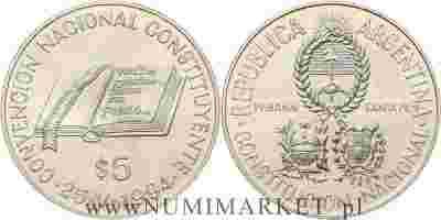 Argentyna, 5 pesos, 1994 rok, Konstytucja, Ag