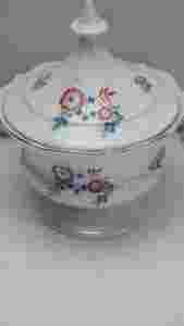 Forma i kształt typowe dla art-deco. Dekorowana kalkomanią w czerwone i niebieskie kwiatuszki. Porcelana biała dodtkowo zdobiona złotymi obwódkami.