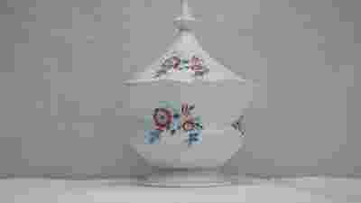 Forma i kształt typowe dla art-deco. Dekorowana kalkomanią w czerwone i niebieskie kwiatuszki. Porcelana biała dodtkowo zdobiona złotymi obwódkami.