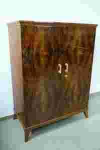 Oferujemy Państwu piękną bieliźniarkę Art deco z lat 30 tych XX w., wykonaną w jednym z warsztatów Europy środkowej. Mebel wykonany został z drewna sosnowego fornirowanego ozdobnie usłojonym drewnem orzechowym. Bieliźniarka ma prostą a jednocześnie elegancką formę. Kubiczny korpus opiera się na zwężanych i szablasto odgiętych nóżkach. Zwieńczenie korpusu stanowi lekko nadwieszony blat o półkoliście wciętej krawędzi. Od frontu korpus zamyka para drzwiczek z uchwytami w formie bakelitowych walców, osadzonych na mosiężnych tarczkach. Wnętrze mebla jest jednoprzestrzenne i mieści cztery ogromne szuflady. Przechowywanie bielizny jest pierwotną funkcją mebla ale jego forma jest bardzo uniwersalna i może służyć np. do przechowywania dokumentów lub elementów wielkoformatowych np. map, rysunków, szblonów, rulonów. Mebel jest w znakomitym stanie i nie wymaga jakichkolwiek prac renowacyjnych, może być od razu wstawiony do docelowego pomieszczenia.