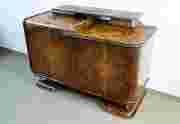 Prezentujemy Państwu niepowtarzalny pomocnik Art deco wykonany w Krakowie przez pracownię mebli artystycznych Adama Klęka, mieszczącą się na Stradomiu nr 15. Mebel pochodzi z ekskluzywnego kompletu salonowego wykonanego na zamówienie w latach 30 tych XX w. Konstrukcja mebla wykonana jest bardzo solidnie z drewna sosnowego. Wnętrza szafek wyklejono jasnym fornirem olchowym, do wykonania szuflad użyto litej olchy. Do wyklejenia elementów od zewnątrz użyto dwóch odmiana bardzo wzorzystego, selekcjonowanego forniru orzechowego. Mebel opiera się na masywnych, profilowanych stopach o wyokrąglonych narożach. Korpus jest asymetryczny z lewą częścią nieco wyższą, zamykany parą drzwiczek. Funkcjonalnie wnętrze podzielone na szafkę z półką po lewej i trzy szuflady (dwie na sztućce, wyklejone pluszem) po prawej stronie. Dolna krawędź lewego boku korpusu, zewnętrzna krawędź prawych drzwiczek oraz górna krawędź nad drzwiczkami z lewej strony zostały przyokrąglone. Elementy o przyokrąglonych krawędziach zostały dodatkowo podkreślone listwowym półwałkiem fornirowanym ciemnym orzechem kalifornijskim. Półwałek obiega w górnej części fragment lewych drzwi (służąc za uchwyt) oraz prawe drzwi i bok. U dołu korpusu druga listwa obiega prawy bok, front i przy lewej jego krawędzi przechodzi miękkim łukiem ku górze by podkreślić lewą krawędź frontu i blatu. Całość wieńczy niewielka nastawka w formie umocowanej z tyłu blatu płytkiej półeczki, opartej na dwóch stopach różnej długości równoważących różnicę wysokości korpusu. Wyższej, wciętej stopie z prawej strony i równie szerokiej, niskiej stopce obwiedzionej ciemnym półwałkiem z lewej strony. Mebel jest w oryginalnym stanie i z racji wieku nosi ślady normalnego użytkowania. Może być używany w obecnym stanie choć renowacja przywróciłaby mu dawny blask. Przydała by się wymiana politury, naprawa opadniętych drzwiczek dorobienie kluczyka, wymiana pluszu na szufladach.