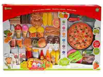 Wielo przedmiotowy zestaw przyda się w każdym domowym sklepiku spożywczym lub kuchni. Każde małe dziecko uwielbia robić z mamą, tatą zakupy lub pomagać w kuchni. Czasami brakuje nam pomysłu co można dziecku dać do zabawy, aby mogło bezpiecznie bawić się w gotowanie lub robienie zakupów. Dzięki różnorodności asortymentu bez problemu stworzy wyśmienity posiłek. Fantastyczny pomysł na zabawę w dom, zakupy. Są tu między innymi: - ciasteczka - czekoladki - rogaliki - lody - rurki z kremem - napoje - hamburger - frytki - nózki z kurczaka - keczup - lemoniada - czekolada do picia - przyprawy - talerzyki - sztućce - pizza - nóż do krojenia pizzy - łopatka do pizzy Poprzez zabawę w sklep dziecko może w łatwy i przyjemny sposób nauczyć się zasad robienia zakupów, wartości pieniądza itp. Dzieci uwielbiają edukacyjne zabawy, w których mogą naśladować dorosłych. Super zestaw artykułów spożywczych, które znakomicie sprawdzą się podczas zabaw w dom, sklep, przyjęcie. Każde dziecko lubi zabawy w zakupy, dom, kuchnie a dzięki naszym produktom zabawa będzie jeszcze fajniejsza. Zestaw jest bardzo kolorowy wykonany z wysokiej jakości plastiku. Kolorowy zestaw zapewni mnóstwo frajdy każdemu małemu smykowi.
