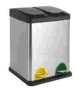 Podwójny kosz do segregacji odpadów. Obudowa kosza wykonana ze 100% stali nierdzewnej, pokrywy, podstawa oraz wkłady wykonane z tworzywa sztucznego PP.