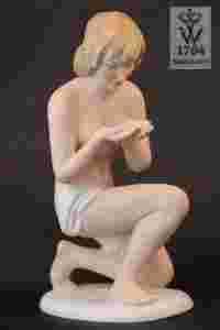 Bardzo piękna figurka - naga kobieta z manufaktury WALLENDORF. Bardzo efektowne połączenie porcelany biskwitowej ze szkliwioną. Subtelna i delikatna figurka wykonana z lekko malowanej porcelany.