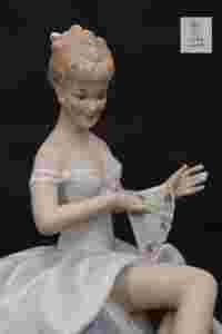 Bardzo piękna figurka - dama z wachlarzem z manufaktury WALLENDORF. Bardzo efektowne połączenie porcelany biskwitowej ze szkliwioną. Subtelna i delikatna figurka wykonana z lekko malowanej porcelany.