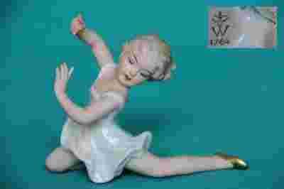 Bardzo piękna figurka - mała baletnica z manufaktury WALLENDORF. Bardzo efektowne połączenie porcelany biskwitowej ze szkliwioną. Subtelna i delikatna figurka wykonana z lekko malowanej porcelany.