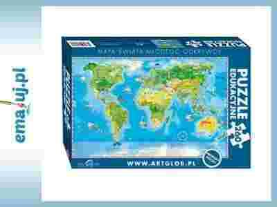 Puzzle z mapą świata dla dzieci, mogą pełnić rolę zarówno edukacyjną, jak i zabawową. Na obrazku zaznaczono barwnie kontynenty wraz z ukształtowaniem terenu, jak też za pomocą kolorowych piktogramów najbardziej znane budowle świata, zwierzęta, pomniki przyrody, wydarzenia. Dzięki temu mapa jest fascynującym źródłem wiedzy o historii i teraźniejszości naszej planety. Przekazuje w ciekawy sposób informacje z zakresu geografii, przyrody i kultury. Pobudza wyobraźnię, zachęca do zdobywania wiedzy i inspiruje. Jest również świetnym pretekstem do spędzania w twórczy sposób wspólnego czasu rodziców z dziećmi. Jakość i estetyka wykonania sprawiają, że stanowi idealny pomysł na prezent.