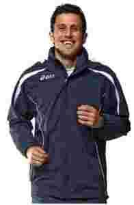 Męska przeciwdeszczowa kurtka z kapturem do biegania lub innych sportów np. nordic walking Asics Jacket Rain. Wykonana z materiału 100% Nylon. Po bokach kurtka sportowa posiada dwie kieszenie zamykane na zamek. Wewnątrz znajduje się podszewka z siateczki. Ściągacze rękawów wykończone elastyczną gumą, dolny ściagacz luźny, regulowany za pomocą elastycznego sznurka. Kurta sportowa Asics posiada kaptur chowany w kołnierzu.