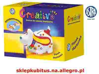 Zestaw do samodzielnego wykonania pieska skarbonki.Doskonale rozwija zdolności manualne dzieci. W zestawie 1 wykonany z ceramiki piesek skarbonka, 6 kolorów farb akrylowych, pędzelek. Zestaw przeznaczony jest dla dzieci w wieku od 8 lat. Doskonały pomysł na oryginalny prezent - dziecko może samodzielnie wykonać skarbonkę. Zestawy kreatywne produkowane są przez firmę ASTRA.