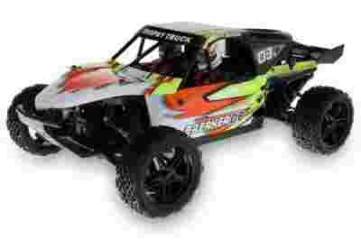 Model posiada ponadto duże, regulowane olejowo-sprężynowe amortyzatory oraz dobrej klasy ogumienie, dzięki czemu świetnie trzyma się podłoża! Wysoko zawieszone podwozie oraz konstrukcja typu sand rail, sprawiają, że jest bardzo zwrotny, stabilny i przede wszystkim wytrzymały! Dzięki tym cechom jest to unikatowy model w skali 1:10 w tej klasie cenowej, chętnie wybierany przez osoby szukające dobrego auta!
