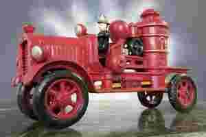 Duży model starego samochodu strażackiego wykonany współcześnie z żeliwa, malowany.