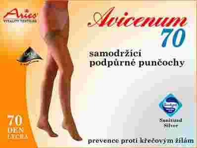 Pończochy profilaktyczne z koronką samonośną AVICENUM 70 wspomagają i poprawiają krążenie krwi. Działają zapobiegawczo przeciwko powstawaniu żylaków i celulitu. AVICENUM 70 zapobiega okresowym obrzękom, np. podczas dłuższego stania lub siedzenia. Apretura antybakteryjna i przeciwgrzybicza Sanitized Silver zawierająca aktywne jony srebra zapobiega rozmnażaniu się mikroorganizmów. Grubość 70 DEN Lycra, skład 76 % Nylon, 24 % Lycra. Ucisk w okolicach kostki 10 - 14 mmHg. Obwód uda 50-60 cm.