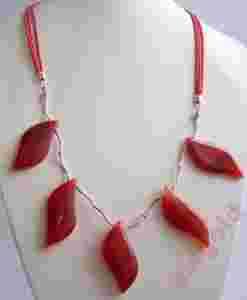 Naszyjnik: listki naturalnych agatów ok. 4,5x2,00cm (piękny naturalny agat w charakterystycznych kolorach, kamienie oszlifowane na połysk), srebrne przekładki próby 925 - na (niewidocznej) lince jubilerskiej, zawieszony na sznureczkach woskowanych w odcieniach agatu