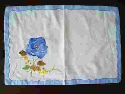 Prześliczna serwetka zdobiona różą i drobnymi kwiatkami z naszywanych fragmentów materiału.