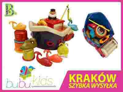 Statek i 12 kolorowych zabawek do kąpieli. W zestawie: figurka kapitana, koło ratunkowe, wędka i 4 rybki do łowienia, 3 kolorowe pojemniki do przelewania, polewania i wkładania jeden w drugi, grzebyk - ośmiornica, wieloryb - szczoteczka do paznokci. Wszystkie zabawki mieszczą się pod pokładem statku.
