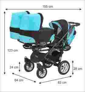Ultralekki wózek dla trojaczków. Waga stelaża bez kół to 8,5kg. Skrętne pompowane przednie koła, trzy gondole i trzy spacerówki, trzy adaptery, w tym jeden do pojedynczego wykorzystania (wózek staje się również zwykłą spacerówką dla jednego dziecka) oraz 3 foteliki samochodowe. W komplecie 6 pokrowców na nóżki, 6 budek (3 głębokie, 3 spacerowe), regulowana wysokość rączki, duży pojemny kosz na zakupy.