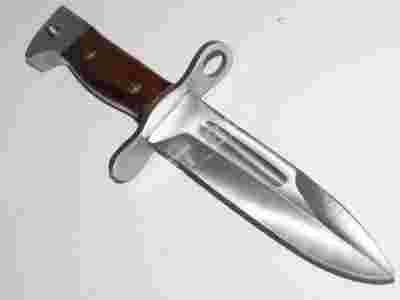 Ciężki, bardzo solidnie wykonany. Ostrze z wysokiej jakości stali nierdzewnej, okładziny z drewna. Do bagnetu dołączony pokrowiec ze skóry ekologicznej, który można nosić przy pasku.