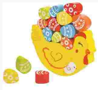 Dwa w jednym: gra zręcznościowa i układanka wykonana z lakierowanego drewna w bardzo ładnej formie. Podstawą gry jest sympatyczna kura, a elementy do układania, to kolorowe jak pisanki jajka.