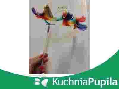 Wędka mini o długości 15 cm z trzema pióropuszami z kolorowych piór i dzwoneczkiem na żyłkach o dł. 25 cm.