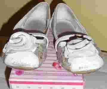 Przedmiotem aukcji są bardzo ładne i wygodne balerynki firmy Magic Fairy z pięknym kwiatkiem w oryginalnym pudelku. Balerynki wykonane ze skóry ekologicznej, a wewnątrz posiadają wyprofilowana wkładkę ze skory naturalnej. Długość wkładki to 17,5 cm. Butki są bardzo ładne i wygodne. Dobrze trzymają się na nóżce dzięki gumeczce. Idealne na wiosnę i lato! Jedyna wada to obdrapane noski. ale to nie przeszkadza w bieganiu po podwórku w ciepły wiosenny lub letni dzień.