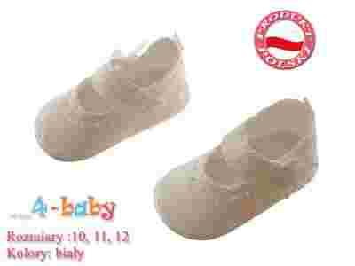 Buciki wykonane z lnu. Niezwykle lekkie i wygodne, umieszczone na miękkiej gumowej podeszwie, wkładka wykonana z delikatnego filcu. Materiałowy pasek na śródstopiu zapinany na rzep, ozdobiony na końcu kokardką i małymi perełkami.